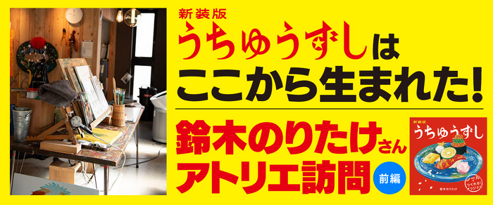 「大ピンチずかん」シリーズなどでおなじみの人気絵本作家・鈴木のりたけさんの最新作『新装版 うちゅうずし』が出版されました。193枚のシールでオリジナルのお寿司を作る、読者参加型の絵本です。今回は鈴木のりたけさんのアトリエを訪問して、アトリエでの過ごし方や愛用している道具についてお話を聞きました。前後編にわたってお届けします。