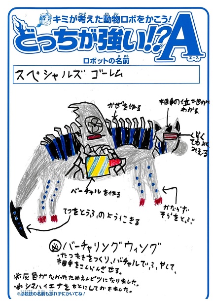 アイディアが面白い!! ロボットを考えるとなると、どうしてもミサイルなどの武器を考えてしまいがちですが、現実の動物の生態を生かした設定が素敵と思いました。
