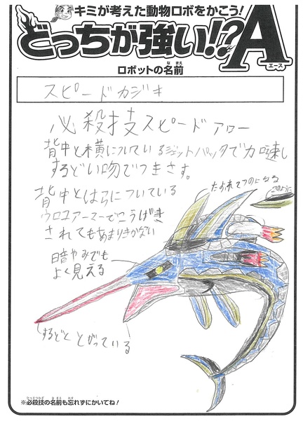 最優秀賞に選ばれた動物ロボット「アリゲーターZ」と「スピードカジキ」は、『どっちが強い!?』シリーズの作家さんが、対決まんがをかき下ろしてくれます! 7月5日(水)発売予定の『どっちが強い!?A③ 海賊船の野望をあばけ』に付いてくる初回限定特典の小冊子に収録されるのでお楽しみに!