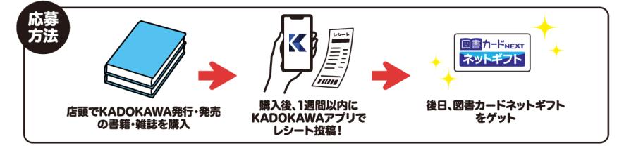 ※レシート対象期間中に書店(実店舗)でKADOKAWA発行•発売の書籍・雑誌を購入したレシートと本のバーコードを、購入後1週間以内(1週間後の同じ曜日の23:59まで)にKADOKAWAアプリにご投稿ください。