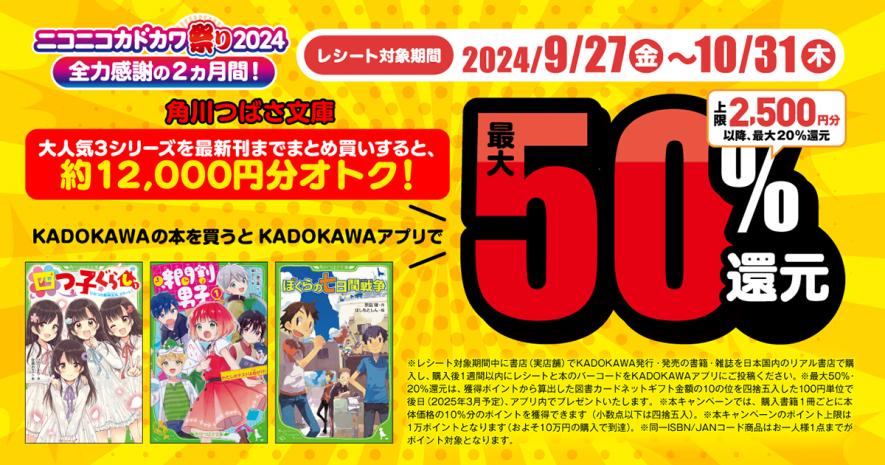 KADOKAWAの全書籍・雑誌を対象に最大50%(上限2,500円分 以降、最大20%還元)が還元されるニコニコカドカワ祭り2024第1弾。