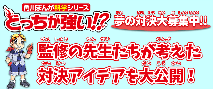 角川まんが科学シリーズの大人気「どっちが強い⁉」シリーズで読んでみたい夢の対決を大大大募集! 生き物であれば何でもOK! 応募用紙に読んでみたい夢の対決とイラストをかいて応募しよう!最優秀作品は作家さんが、まんがをかき下ろしてくれるよ!