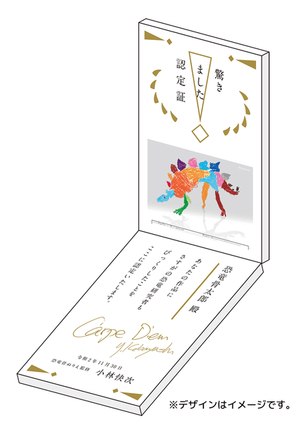 『恐竜 骨ぬりえ』を楽しんで、みんながぬった作品を投稿してください。『恐竜 骨ぬりえ』の監修を手掛けた古生物学者の小林快次先生と、著者の岡田善敬さんを驚かせた人のなかから20名様に、オリジナル「驚きました認定証」をプレゼントします!