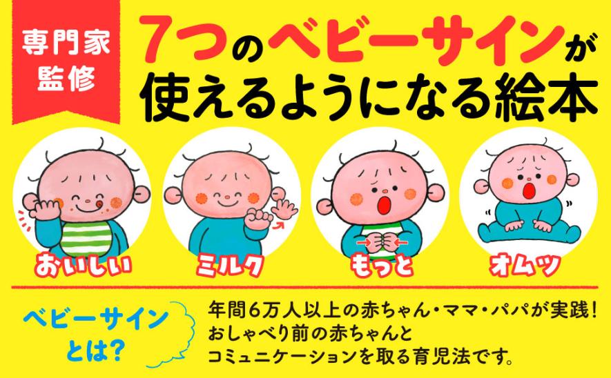 本作は、はじめてベビーサインに触れる赤ちゃん・ママ・パパに向けて、おいしい/ミルク/もっと/オムツなど、日常生活で使う7つのベビーサインを厳選して掲載。