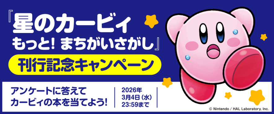 2026年2月26日(木)に『星のカービィ もっと! まちがいさがし』が発売! 『星のカービィ まちがいさがし』に続く待望の続編です。これを記念して、カービィの本が当たるキャンペーンを開催します。
