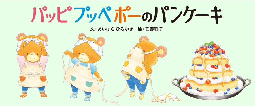 人気絵本シリーズ「くまのがっこう」のあいはらひろゆきさんと、『いちばんしあわせなおくりもの』で第7回リブロ絵本大賞受賞の宮野聡子さんの新作絵本『パッピプッペポーのパンケーキ』。