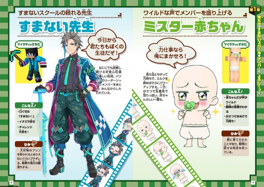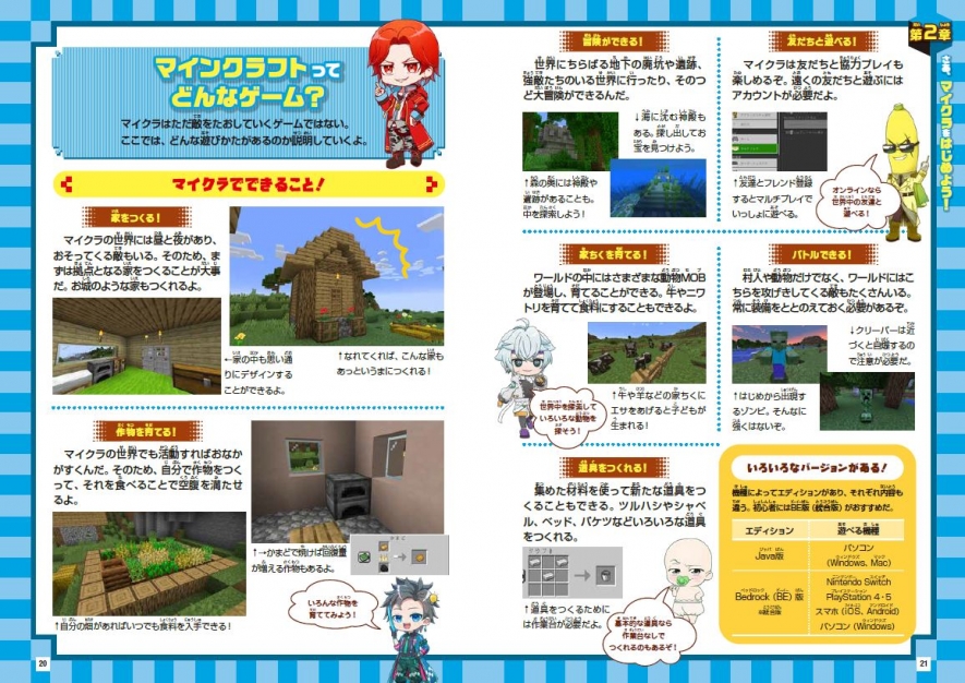 キャラ紹介はもちろん、マイクラのあそび方もこの1冊でたっぷり紹介しています。