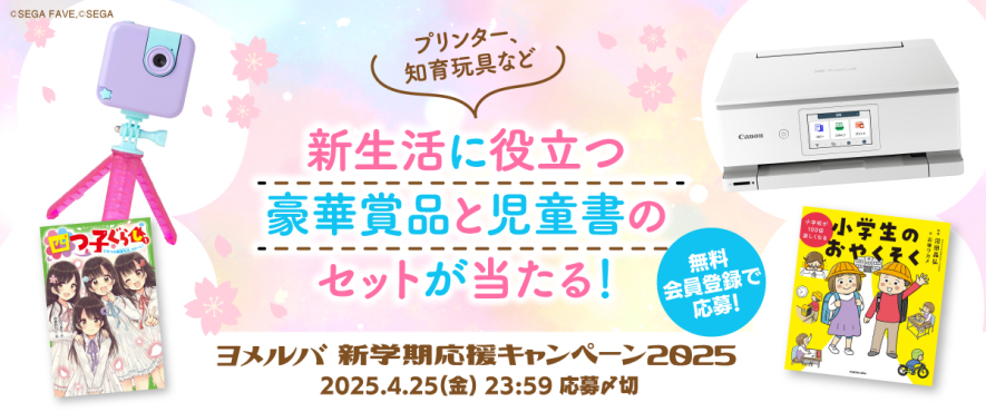 ヨメルバ会員に登録し、アンケートにこたえてくれた方の中から抽選で、プリンターや知育玩具など、新生活に役立つ豪華賞品と児童書のセットが当たるキャンペーンを実施します!