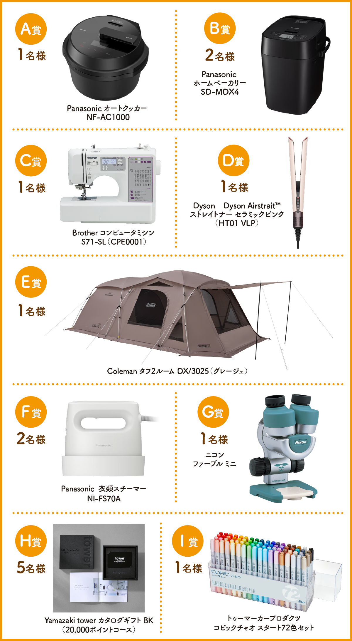 読者の皆さまへ日ごろの感謝の気持ちを込めて、オートクッカーやコンピュータミシン、Colemanのテントなど、家族で使える賞品をご用意。