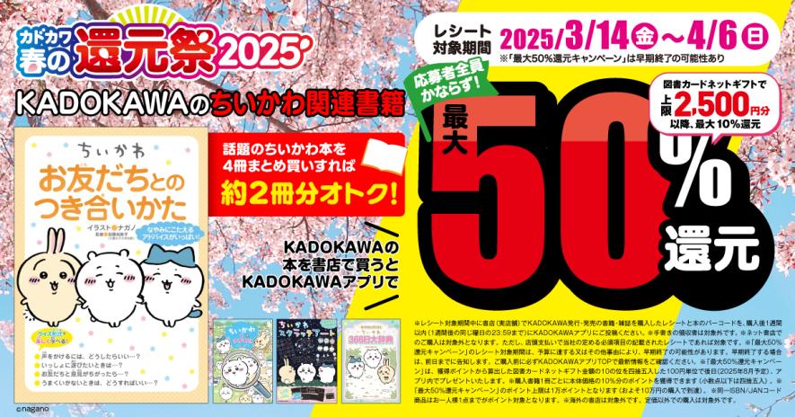 全書籍・雑誌を対象に最大50%還元(上限2,500円分 以降、最大10%還元)となる「カドカワ春の還元祭2025」が開催中!