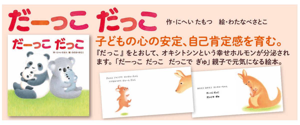 「おめめ ぱっちり こりすちゃん ママをみて にっこ にこ」「うれしい うれしい こりすちゃん だーっこ だっこ だっこで ぎゅ」 コアラちゃん、おさるちゃん、カンガルーちゃん、パンダちゃん、そして、人間の赤ちゃん。ママは、「おいで おいで だいすきあかちゃん だーっこ だっこ ママだっこ ぎゅ」 パパは、「げんきに そだて だいすきあかちゃん だーっこ だっこ パパだっこ ぎゅ」 赤ちゃんもママパパも、心が元気になり、優しい気持ちとゆとりを与えてくれる絵本。