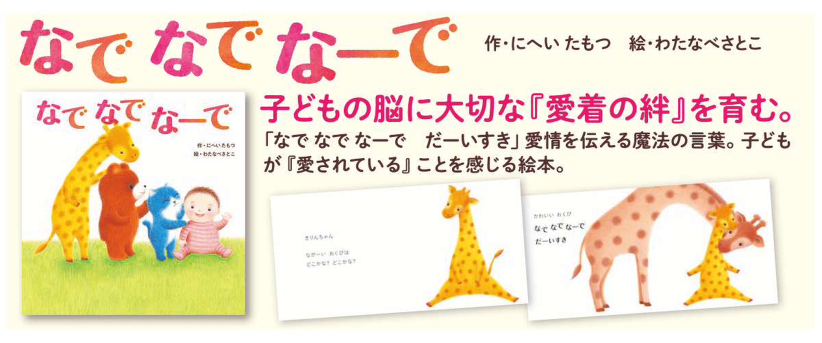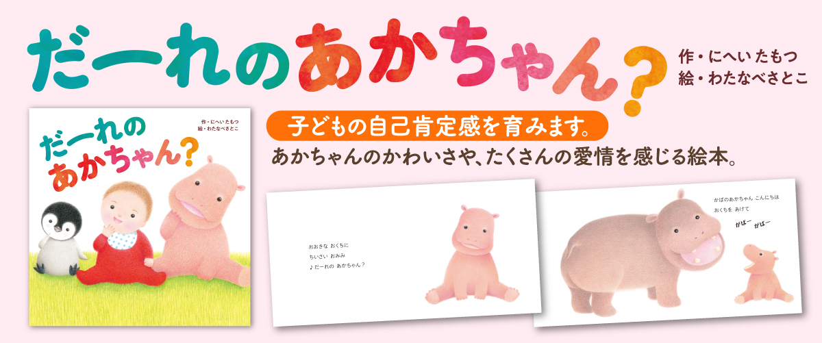 ぺんぎん、うま、いのしし、パンダ、かば、人間のあかちゃんが登場します。リズミカルな文と楽しい擬音語で、あかちゃんのかわいさや、絵本を読んでもらっているお子さんが愛されていることを感じることができます。「げんきに おおきくなーれ!」と愛情をこめて読んであげると、子どもの脳の発達に大切な『自己肯定感』が育まれます。