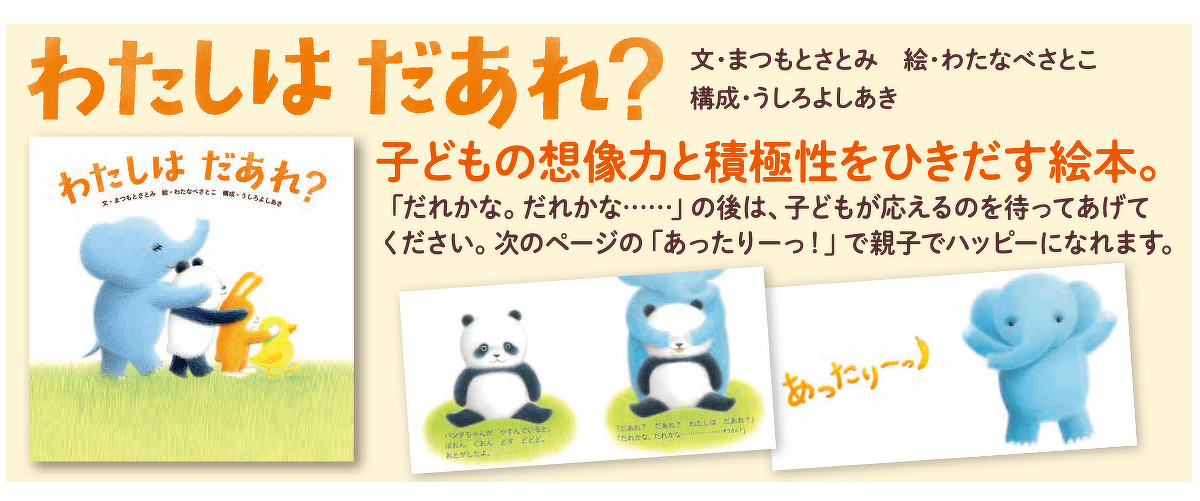 あひるちゃんがすわっていると、「わたしは だあれ?」「だれかな……うさぎさん?」 あったり~っ! うさぎちゃんがすわっていると、「わたしは だあれ?」「だれかな……パンダちゃん?」 あったり~っ! パンダちゃんがすわっていると、「わたしは だあれ?」「だれかな……ぞうさん?」 あったり~っ! ぞうさんがすわっていると、「わたしは だあれ?」は、ありません。「つまんないな」 すると、「だあ~れ~? だあ~れ~? わたしは だあ~れ~?」「…………おばけ?」 最後はいったい、だあれ? 読み聞かせをすると、子どもが「わたしはだあれ?」にこたえてくれて、「あったり~っ!」で笑いがおこる! 子どもと楽しいコミュニケーションができる絵本!