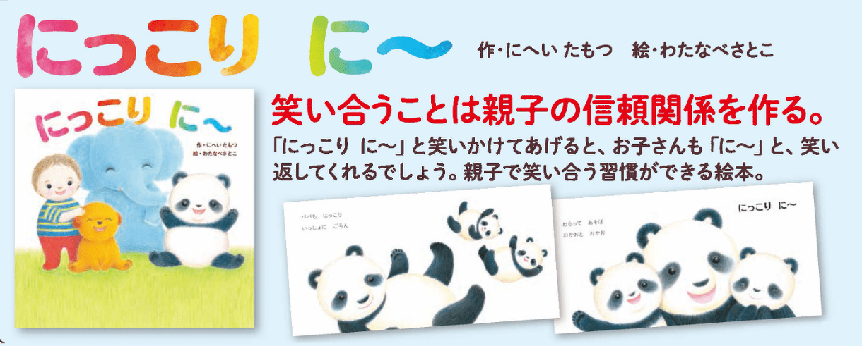 赤ちゃん、お子さんに「にっこり に~」と、笑いかけてあげてください。笑いかけられたお子さんは、『愛されていること』を感じ、愛着と自己肯定感が育まれます。「にっこり に~」を繰り返すうちに、お子さんも「に~」と、笑い返してくれるでしょう。笑い合うコミュニケーションは、親子の信頼関係を築き、子どもの生きる力を作ります。「おかおと おかお にっこり に~」親子で笑い合う習慣ができる絵本です。