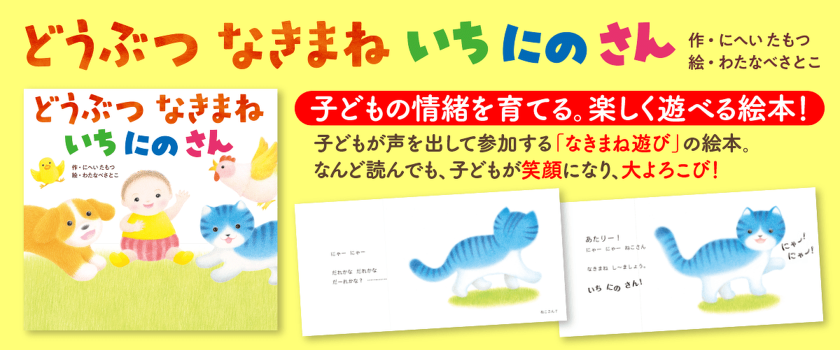 後ろ姿のかわいい絵のいぬ、さる、ねこ、うし、ひよこ、にわとりが登場して、「だーれかな?」と問いかけると、子どもが答えてくれます。「あたりー!」と言われて、子どもたちは何度でも、うれしい気持ちになります。そして、「なきまね し~ましょう。いち にの さん!」で、子どもと動物の鳴きまねの「まねっこ遊び」。最後には赤ちゃんと動物みんなが登場して、「わん わん、うっきー うっきー、にゃー にゃー、もーもー、ぴよぴよ、こけっこー」と、みんなでなきまね!