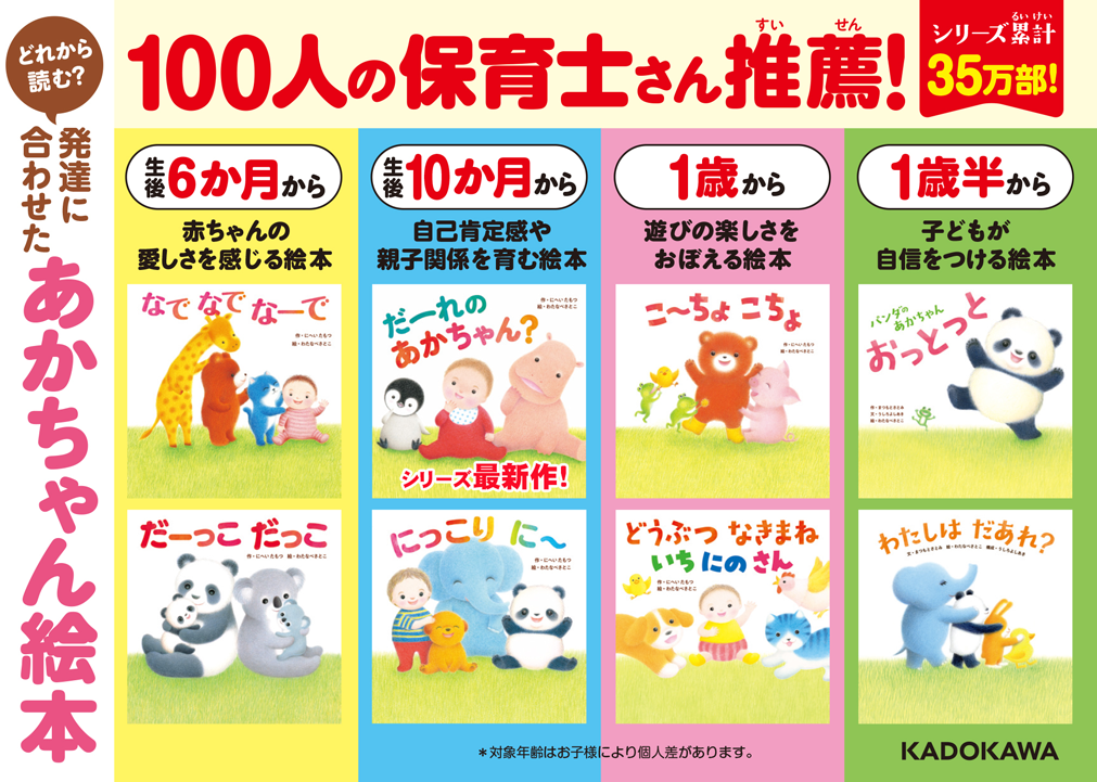 絵本の文や絵の制作中に保育士さんに読んでもらい、感想や意見をふまえて作っている「100人の保育士さん推薦」シリーズは、多くの乳幼児に愛され、親子に支持されています。