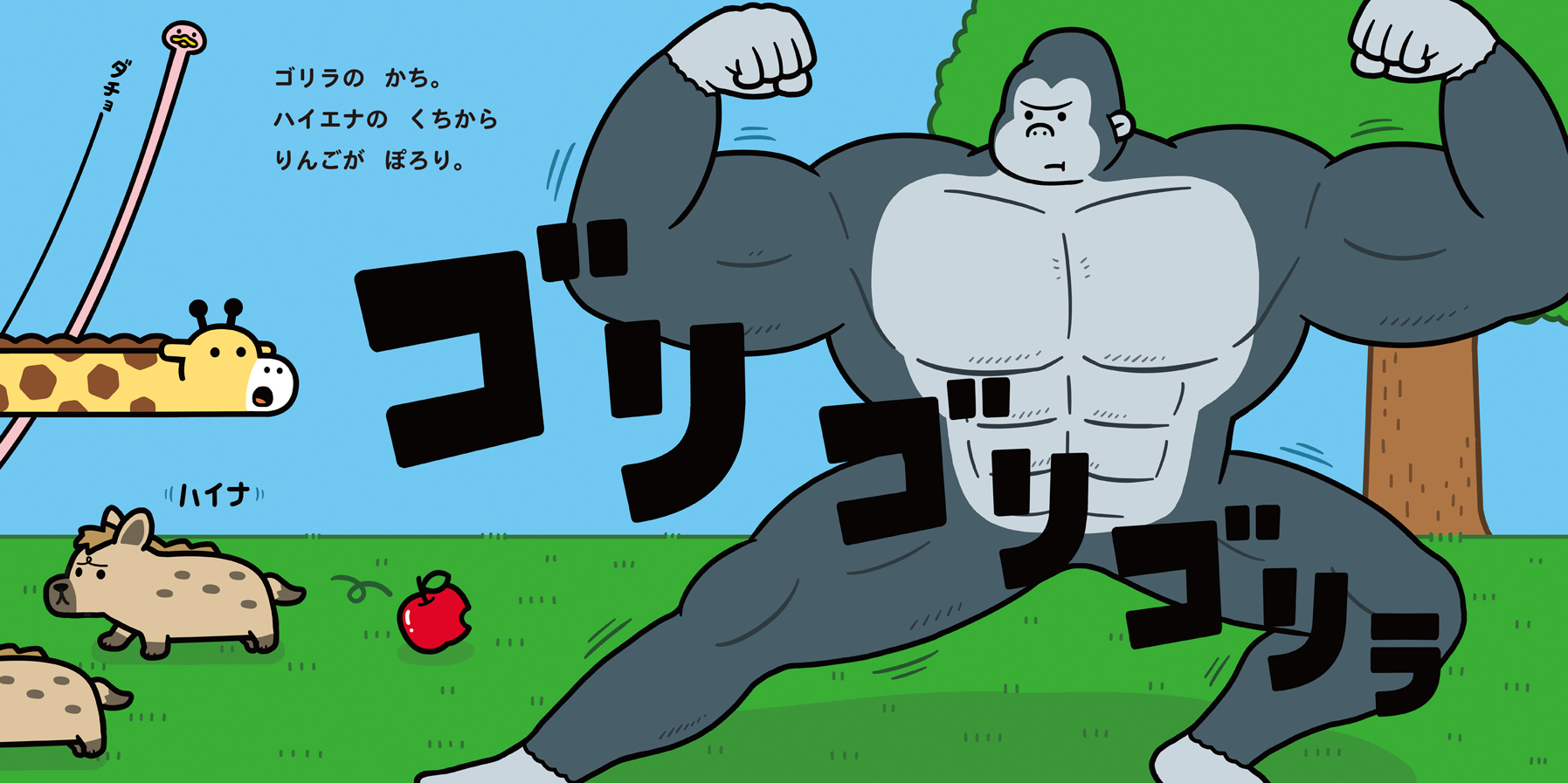 「キリンリンリン」「ゾオオオオオオウ」「ハシビロビロビロコウ」「ゴリゴリゴリラ」……動物の名前とオノマトペが合体した独特の言葉遊びと、時に意表を突いた変身をする動物たち。声に出して読みたくなるナンセンス動物ユーモア絵本です。かわいくてクセになる展開で、子どもたちの「もう一回!」が止まりません。