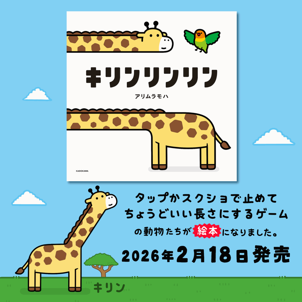 「タップかスクショで止めてちょうどいい長さにするゲーム」の動物たちが大活躍する絵本、『キリンリンリン』が2026年2月18日(水)に発売されます。