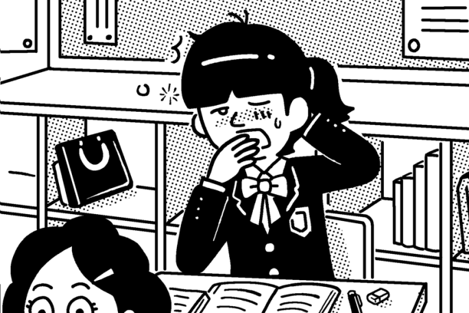 ポニーテールの髪は寝ぐせ隠しで、目の下には睡眠不足のクマがあります。最近、両親ともに忙しいのをいいことに、ゲーム三昧で毎晩夜更かししているのです。今朝は寝坊しましたが、家族もなぜか寝過ごしたので、怒られずに済みました。