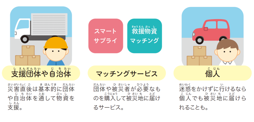 災害直後は被災地の受け入れ体制が整っていないため、基本的に支援団体や自治体を通して物資を支援します。団体や自治体のウェブサイトで最新の情報の確認を。団体や被災者が必要なものを私たちが購入し、現地に届けるマッチングサービスもあります。被災地の道路状況が復旧して緊急車両の通行を妨げず、受け入れ体制も整って迷惑をかけないなら個人で届ける場合も。