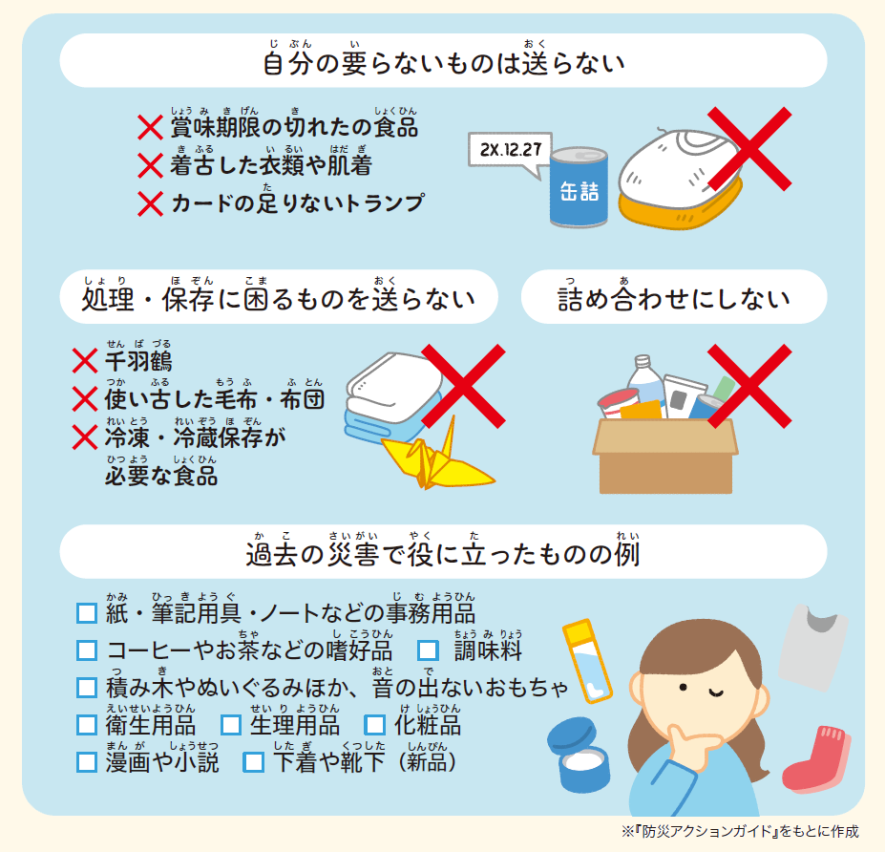 物資の支援では、過去の災害で役に立ったものなどを参考に、被災者の立場を考えて本当に必要なものを送りましょう。