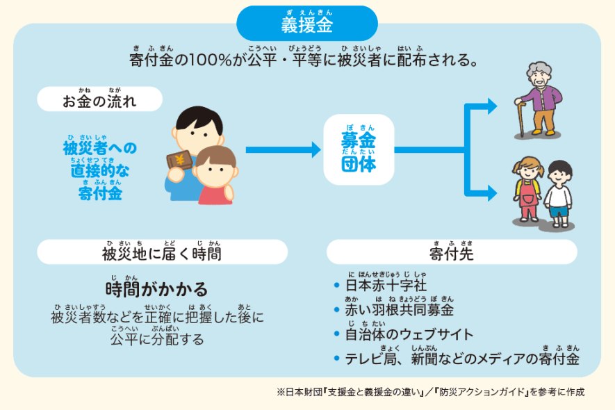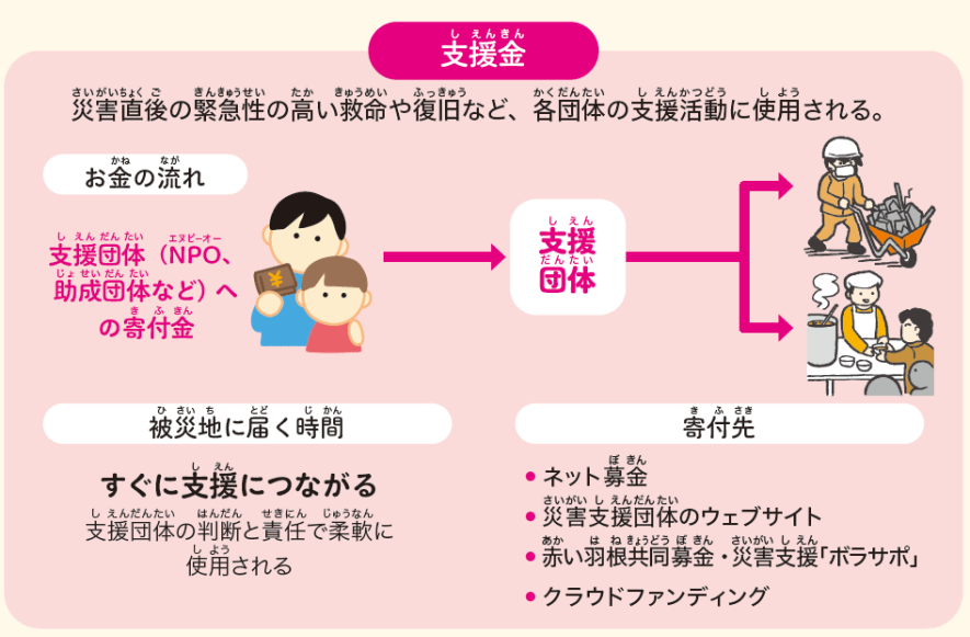 被災地へのお金の支援には、種類があります。ひとつは、支援金。これは災害発生直後に緊急性の高い救命や復旧の活動など、支援団体の活動に使われるお金です。支援金はその団体の判断と責任で柔軟に使用されるため、すぐに被災地の支援につながります。もうひとつは義援金で、寄付金がすべて公平・平等に被災者に配布されます。被災者の数などを確認したあとに配布されるため、支援までに時間がかかります。義援金には手数料等は一切ありませんが、支援金では支援団体が被災地で活動するために必要な経費を手数料としてまかなう場合も。手数料は団体によって異なり、支援活動の内容を調べるのがおすすめです。