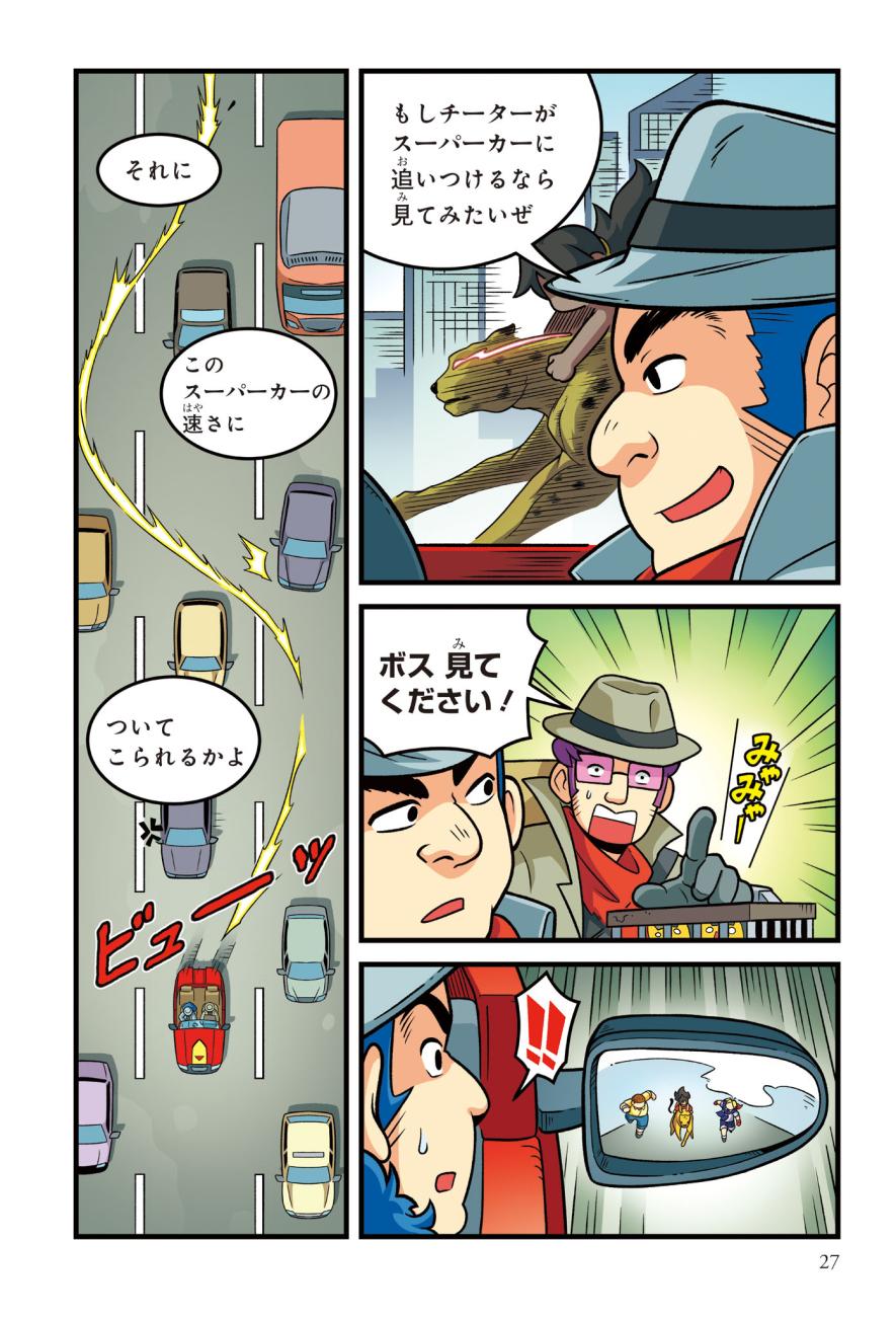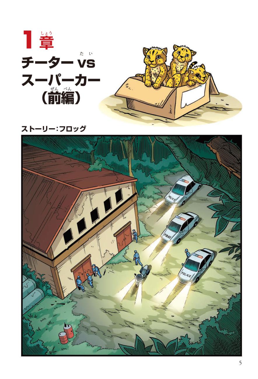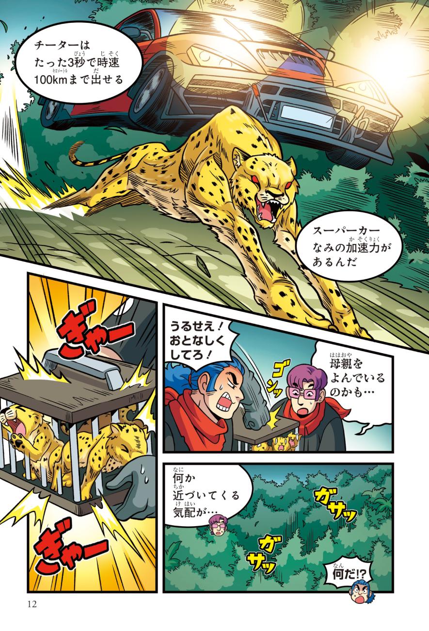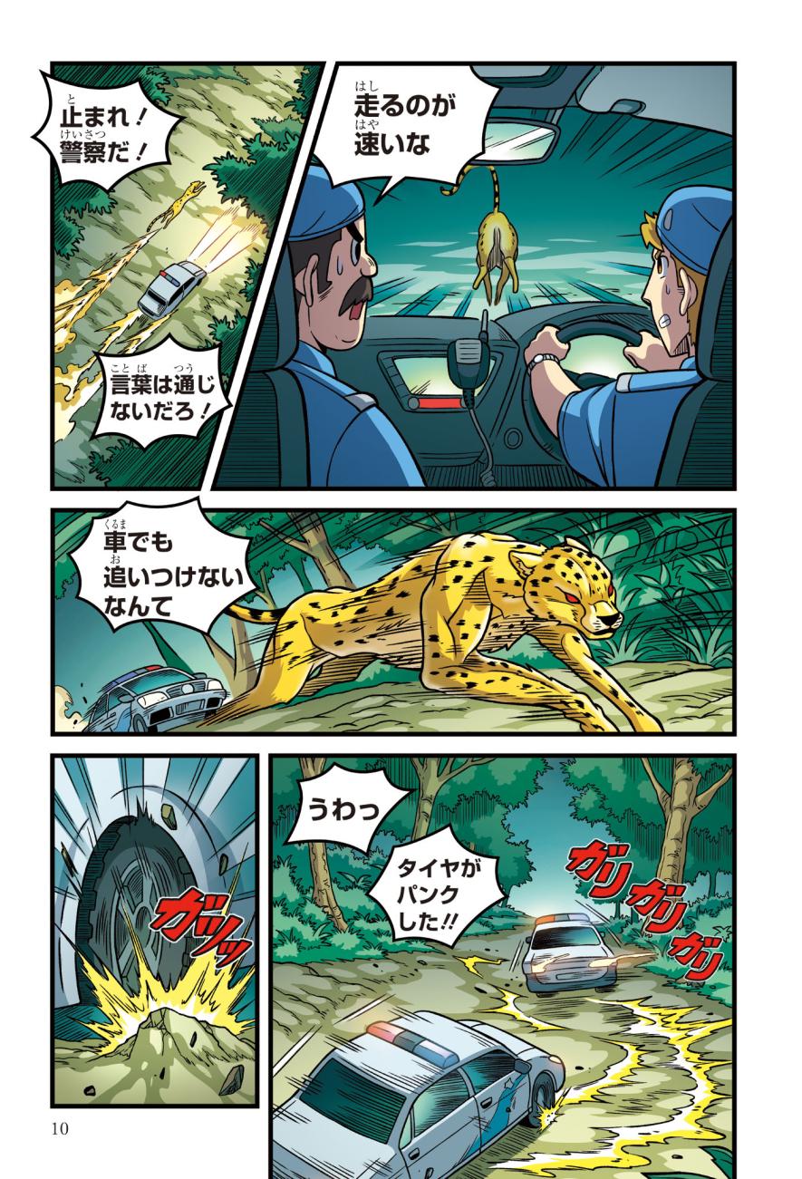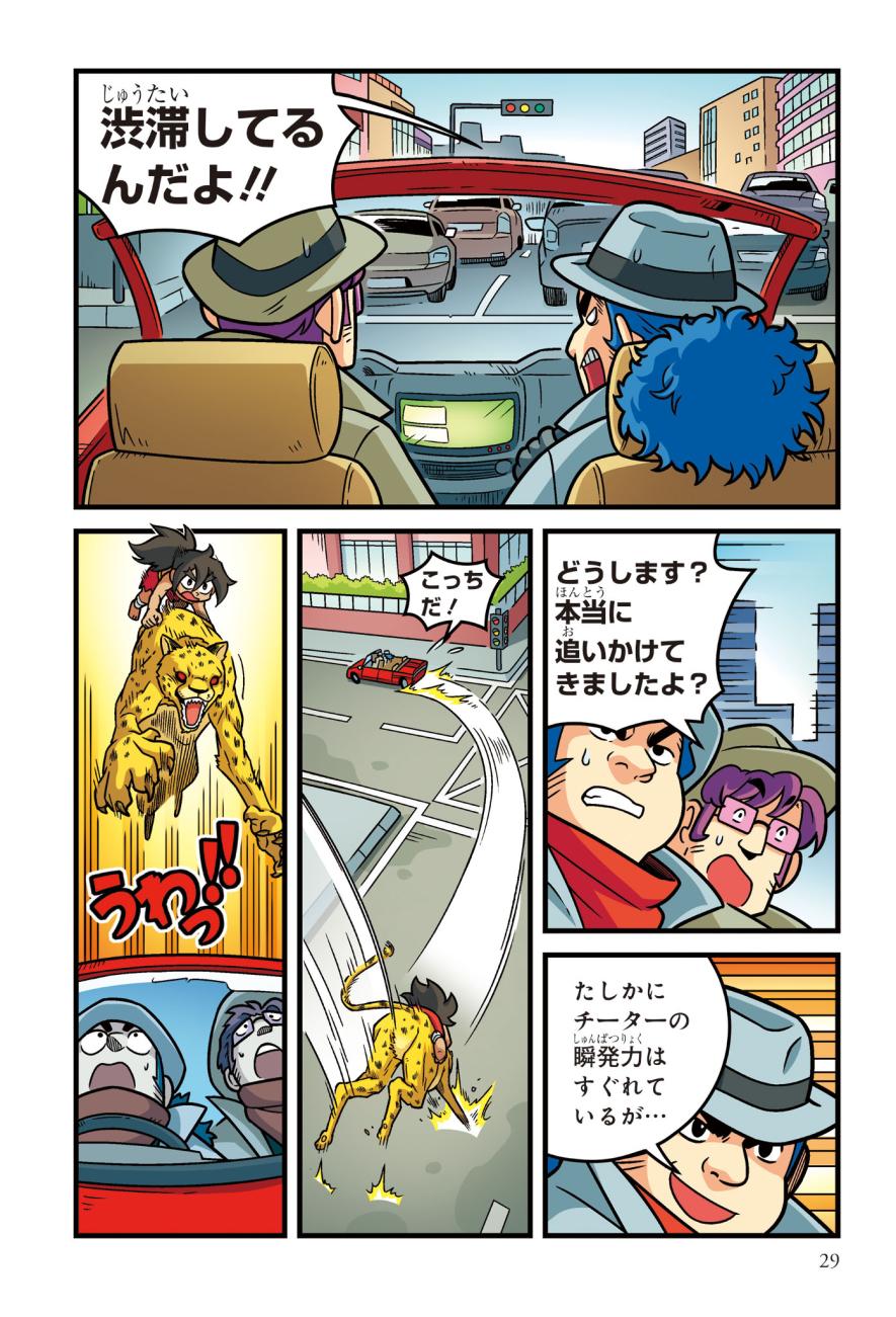 警察にたのまれて、とある町ににげたチーターを探すジェイクたち。チーターはかなり興奮しており、ターゼンが話を聞くと、密猟者に子どもがさらわれたという…。ようやく見つけた密猟者からは、子どもを返す条件は「スーパーカーとの速さ勝負」とつきつけられる。3秒で100キロの速度を出せるチーターは、スーパーカーに勝てるのか!?