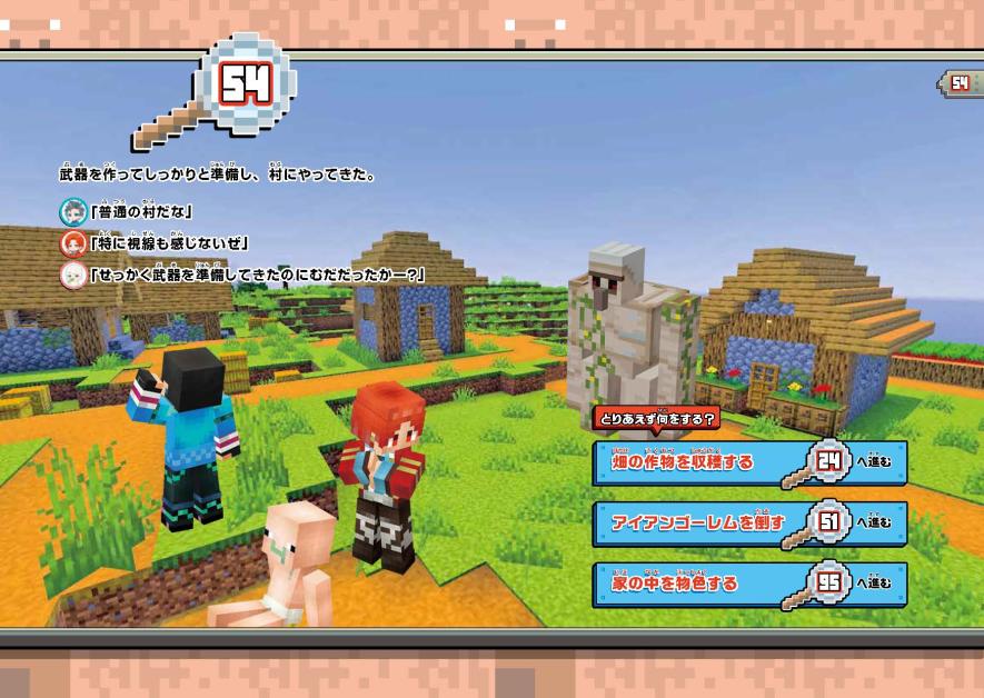 知る・まなぶ 2025.12.10 13 『ウォーターチャレンジ ゲームブック マイクラ都市伝説を調査せよ!』ためし読み キャラぱふぇ マインクラフト この記事をブックマークする 村人に渡された紙を頼りに進み、すまない先生たちは村までやってきた。 とりあえず何をする? 畑の作物を収穫する→24へ進む アイアンゴーレムを倒す→51へ進む 家の中を物色する→95へ進む 書籍情報 ウォーターチャレンジ ゲームブック マイクラ都市伝説を調査せよ! ウォーターチャレンジ ゲームブック マイクラ都市伝説を調査せよ! 監修: ウォーターチャレンジ 【定価】 1,540円(本体1,400円+税) 【発売日】 2025年12月10日 【サイズ】 A5判 【ISBN】 9784049165807 ためし読み 紙の本を買う 電子書籍を買う マイクラの本、ぞくぞく登場! 1 2 この記事をブックマークする この記事をシェアする