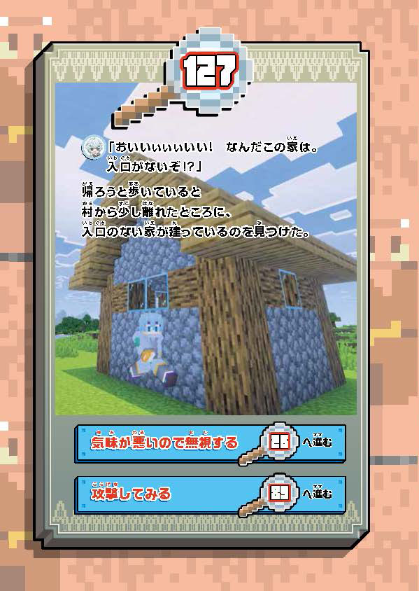 知る・まなぶ 2025.12.10 127 入口のない家を見つけた! 『ウォーターチャレンジ ゲームブック マイクラ都市伝説を調査せよ!』ためし読み キャラぱふぇ マインクラフト この記事をブックマークする 127 入口のない家を見つけた! 気味が悪いので無視する→26へ進む 攻撃してみる→89進む 書籍情報 ウォーターチャレンジ ゲームブック マイクラ都市伝説を調査せよ! ウォーターチャレンジ ゲームブック マイクラ都市伝説を調査せよ! 監修: ウォーターチャレンジ 【定価】 1,540円(本体1,400円+税) 【発売日】 2025年12月10日 【サイズ】 A5判 【ISBN】 9784049165807 ためし読み 紙の本を買う 電子書籍を買う マイクラの本、ぞくぞく登場! この記事をブックマークする この記事をシェアする