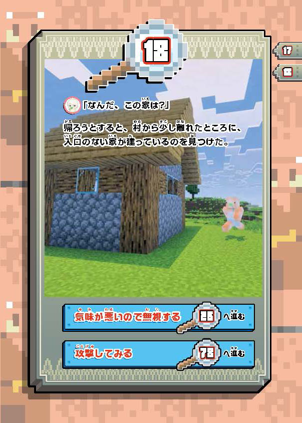 知る・まなぶ 2025.12.10 18 入口のない家を見つけた! 『ウォーターチャレンジ ゲームブック マイクラ都市伝説を調査せよ!』ためし読み キャラぱふぇ マインクラフト この記事をブックマークする 18 入口のない家を見つけた! 気味が悪いので無視する→26へ進む 攻撃してみる→78進む 書籍情報 ウォーターチャレンジ ゲームブック マイクラ都市伝説を調査せよ! ウォーターチャレンジ ゲームブック マイクラ都市伝説を調査せよ! 監修: ウォーターチャレンジ 【定価】 1,540円(本体1,400円+税) 【発売日】 2025年12月10日 【サイズ】 A5判 【ISBN】 9784049165807 ためし読み 紙の本を買う 電子書籍を買う マイクラの本、ぞくぞく登場! この記事をブックマークする この記事をシェアする