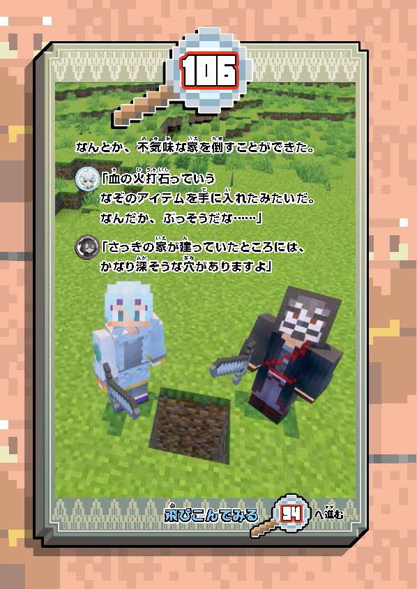知る・まなぶ 2025.12.10 106 不気味な家を倒した! 『ウォーターチャレンジ ゲームブック マイクラ都市伝説を調査せよ!』ためし読み キャラぱふぇ マインクラフト この記事をブックマークする 106 不気味な家を倒した! なんとか不気味な家を倒すことができた。 この続きは『ウォーターチャレンジ ゲームブック マイクラ都市伝説を調査せよ!』で確かめてね。 書籍情報 ウォーターチャレンジ ゲームブック マイクラ都市伝説を調査せよ! ウォーターチャレンジ ゲームブック マイクラ都市伝説を調査せよ! 監修: ウォーターチャレンジ 【定価】 1,540円(本体1,400円+税) 【発売日】 2025年12月10日 【サイズ】 A5判 【ISBN】 9784049165807 ためし読み 紙の本を買う 電子書籍を買う マイクラの本、ぞくぞく登場! この記事をブックマークする この記事をシェアする