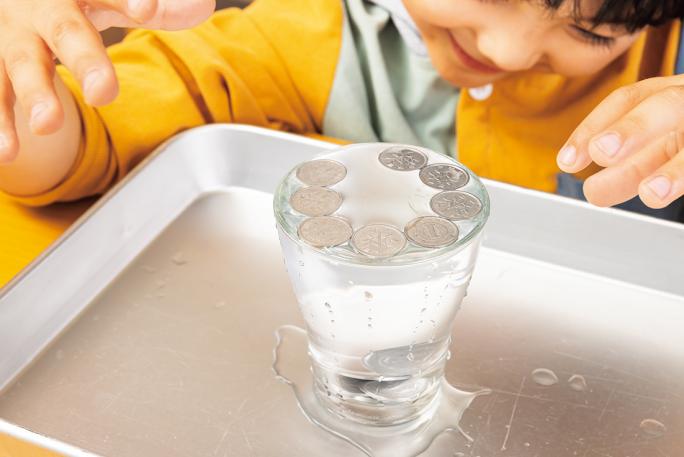 ③ 水がこぼれるぎりぎりまで1円玉を入れる。水面がどうなるか、観察してみよう。
