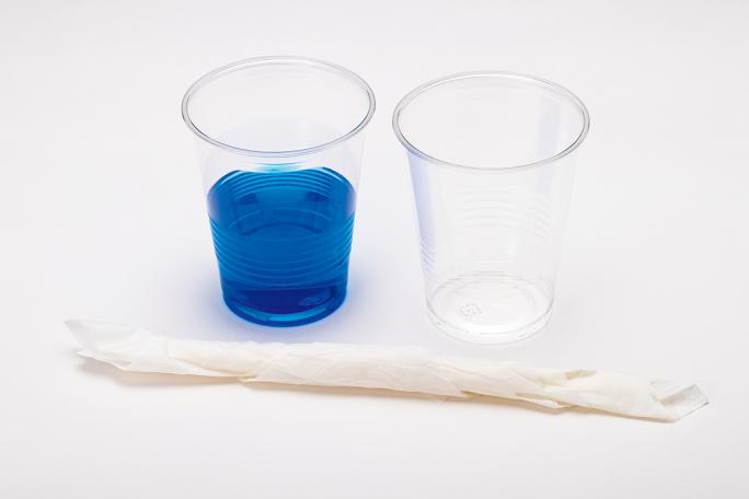 ① 1つのコップに色水を入れる。ティッシュペーパーは2枚重ねて、細くねじる。