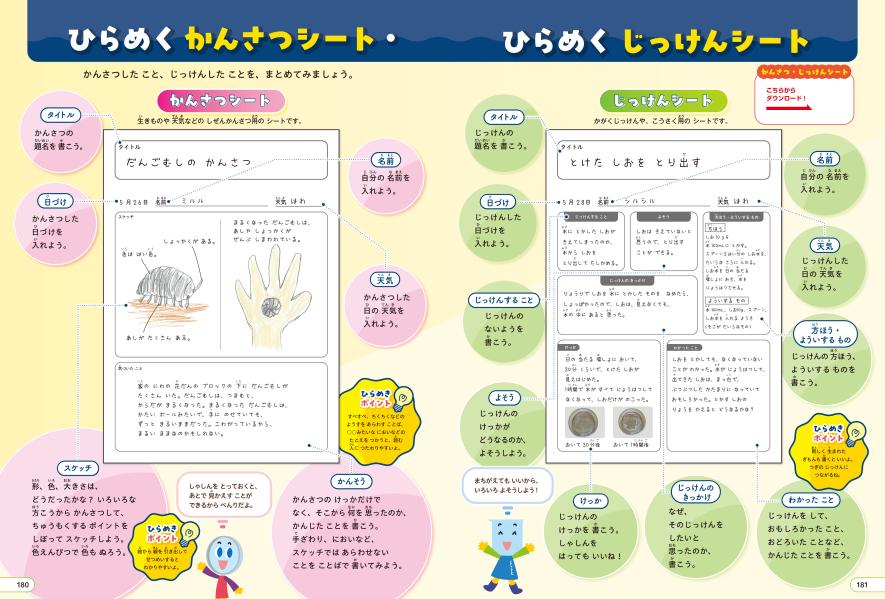 『ひらめく理科』には、「ひらめく かんさつシート」と「ひらめく じっけんシート」をダウンロードできる特典がついています。自由研究や自主学習の宿題にもぜひ活用してください。
