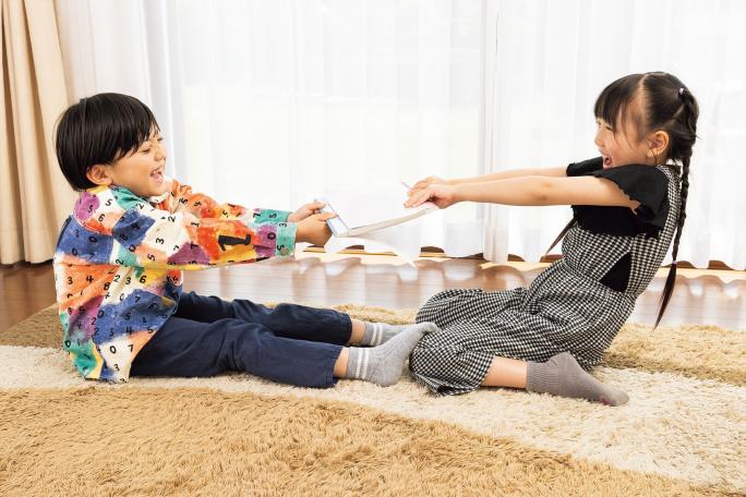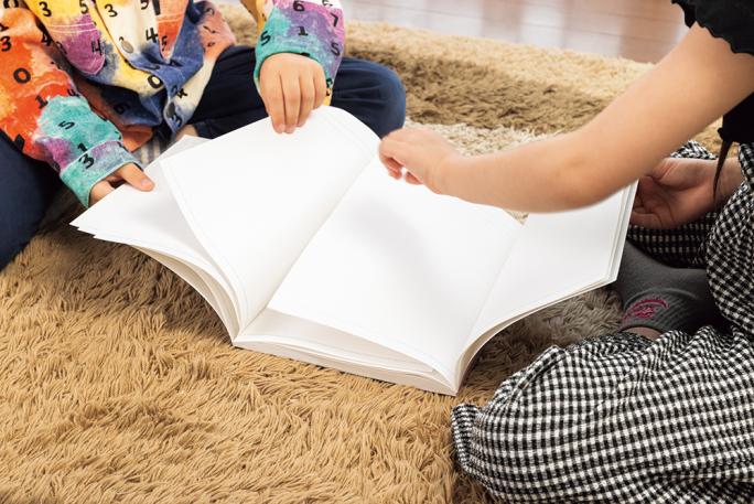 ② すべてのページを重ね終えたら、2人でそれぞれノートを持って引っぱってみよう。