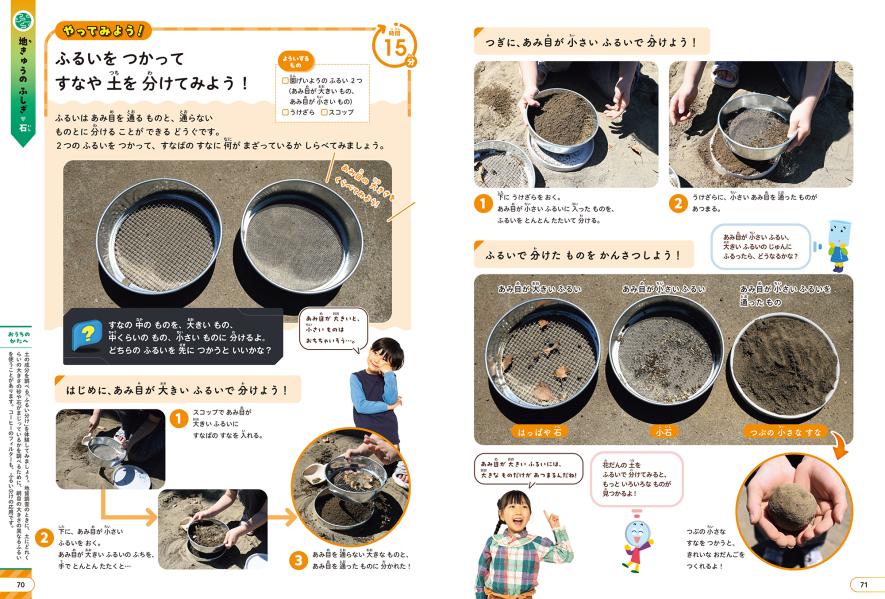 ふるいは、網目を通るものと通らないものとに分けることができる道具。2つのふるいを使って、砂場の砂に何が混ざっているか調べてみましょう。
