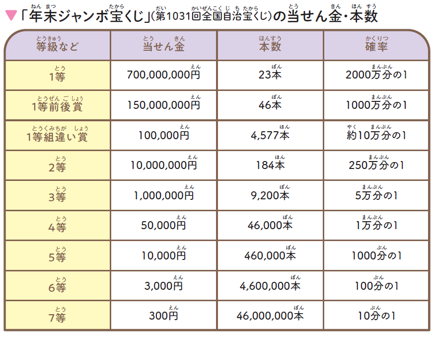 参考元:宝くじ公式サイト「年末ジャンボ宝くじ(第1031回 全国自治くじ)の当せん金・本数」