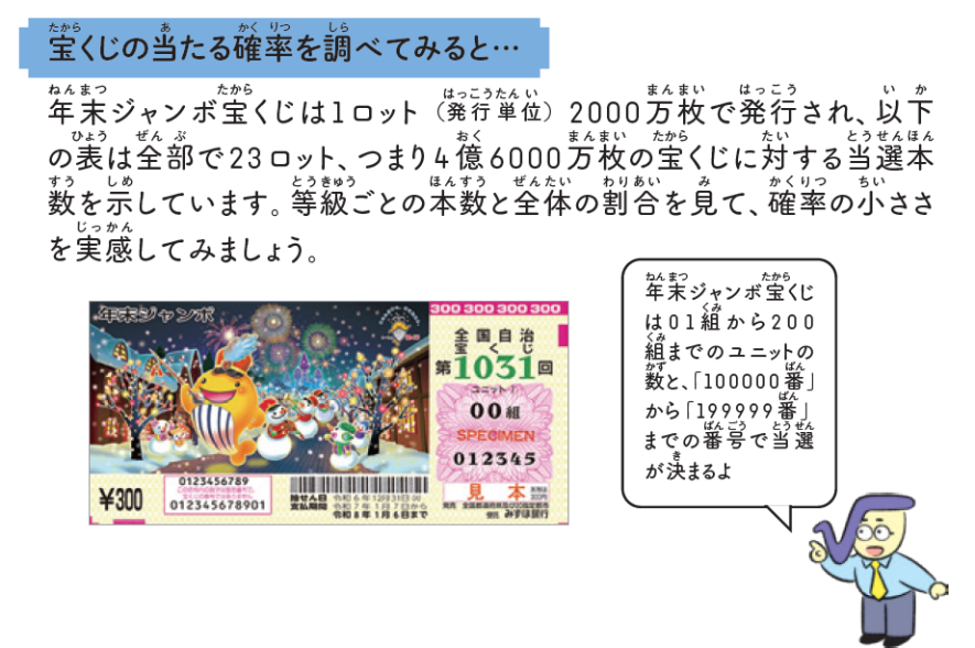 1枚宝くじを買うと、大体いくら当たるかを表す「期待値」という考え方を高校で学びます。年末ジャンボ宝くじの期待値を計算してみると約150となります。これは、300円の宝くじを1枚買うと、150円くらい当たることが期待できるということです。確率を考えると、簡単には当たらないことがわかります。それでも多くの人が期待を込めて宝くじを買っているのです。