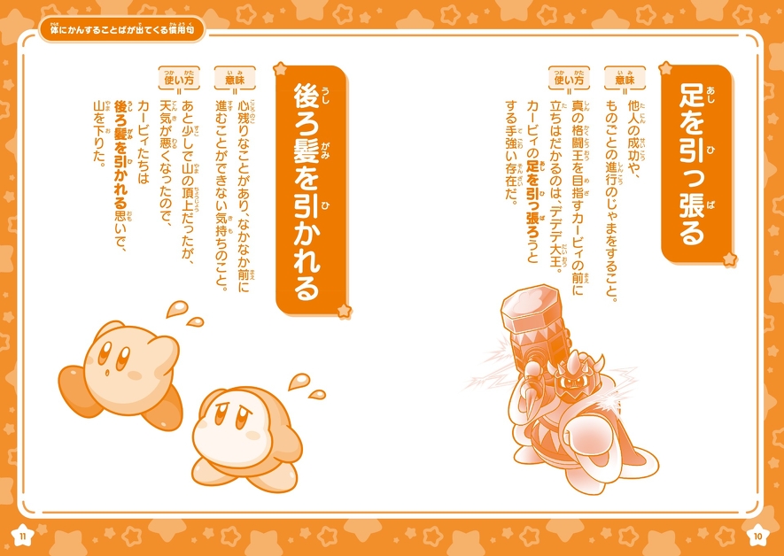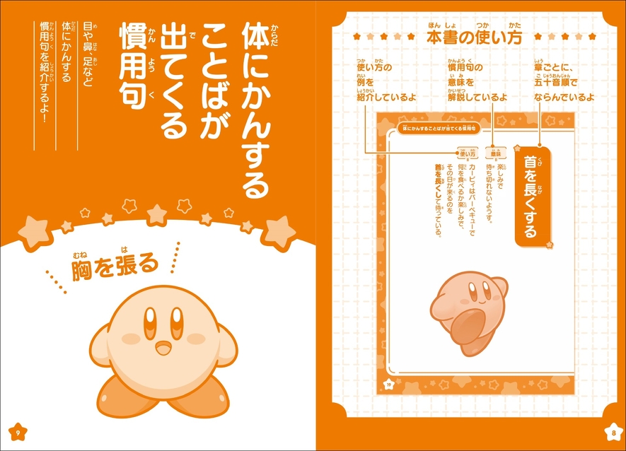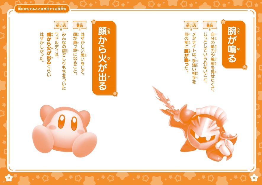 使い方の例文にはカービィや仲間たちが登場するので、楽しみながら慣用句を身につけることができる1冊です!