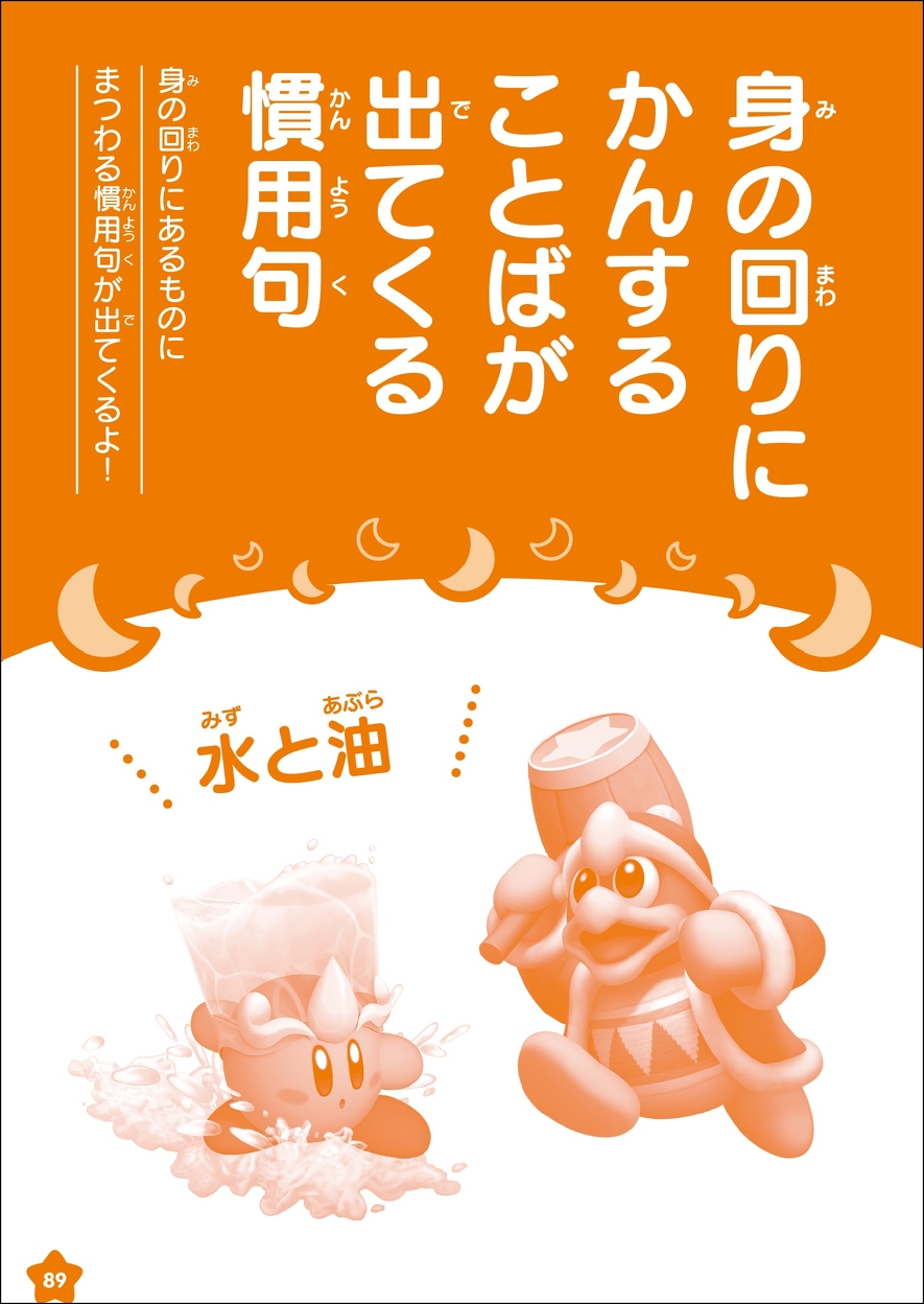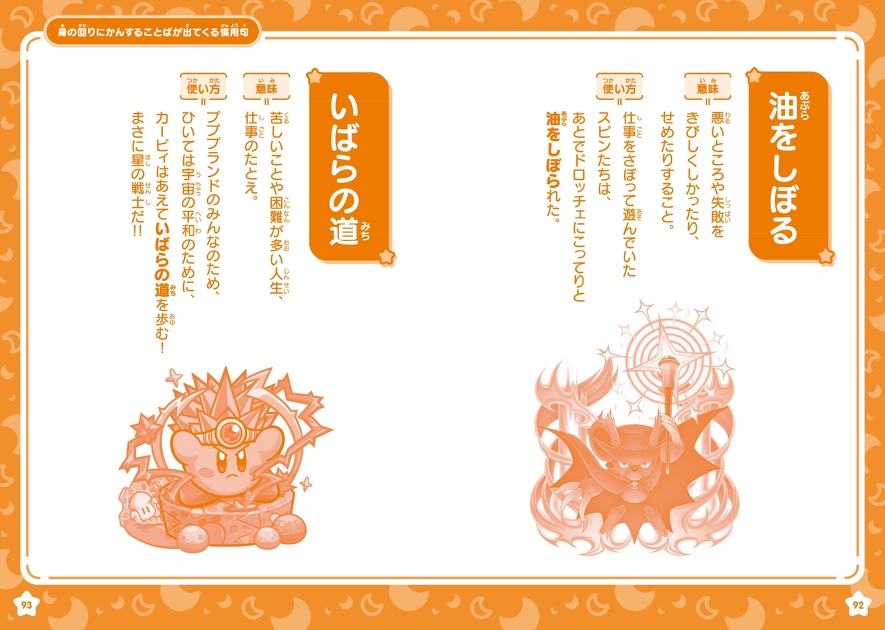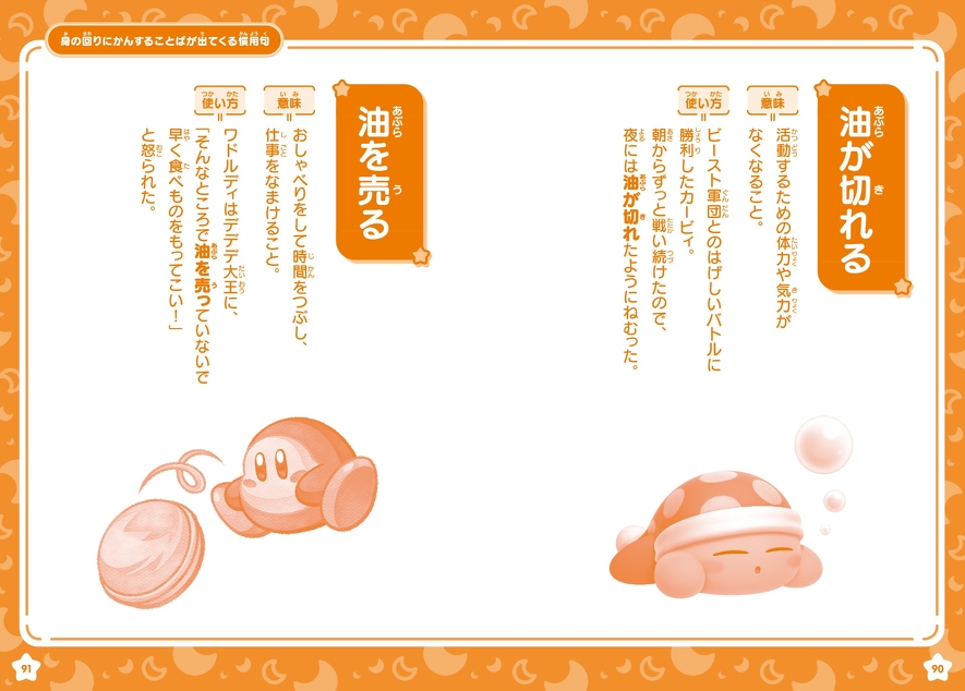 使い方の例文にはカービィや仲間たちが登場するので、楽しみながら慣用句を身につけることができる1冊です!