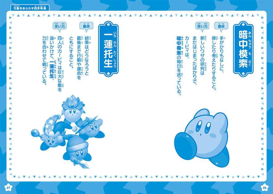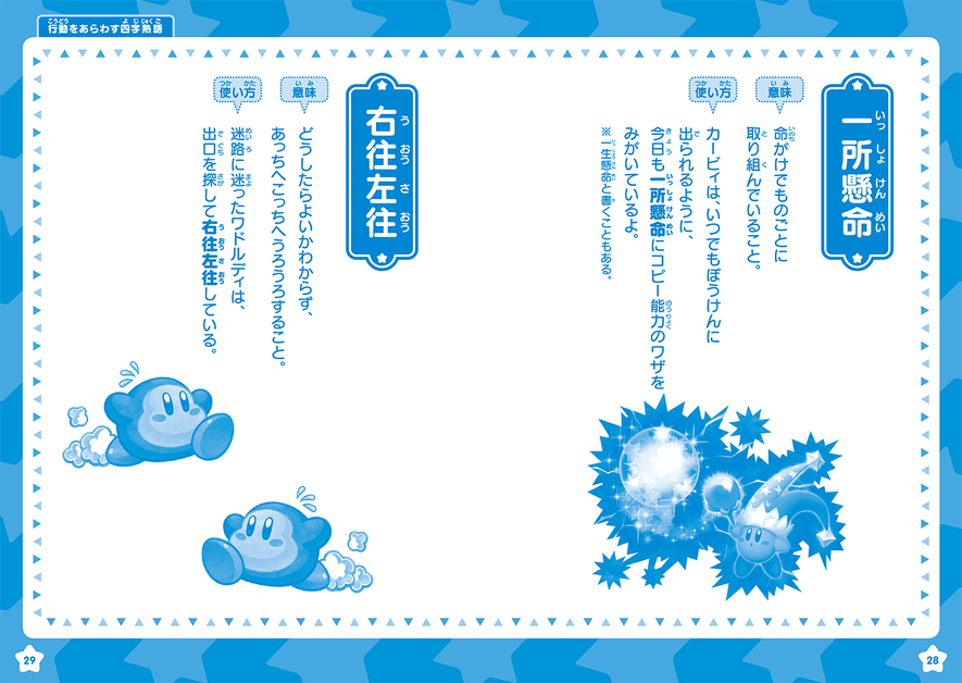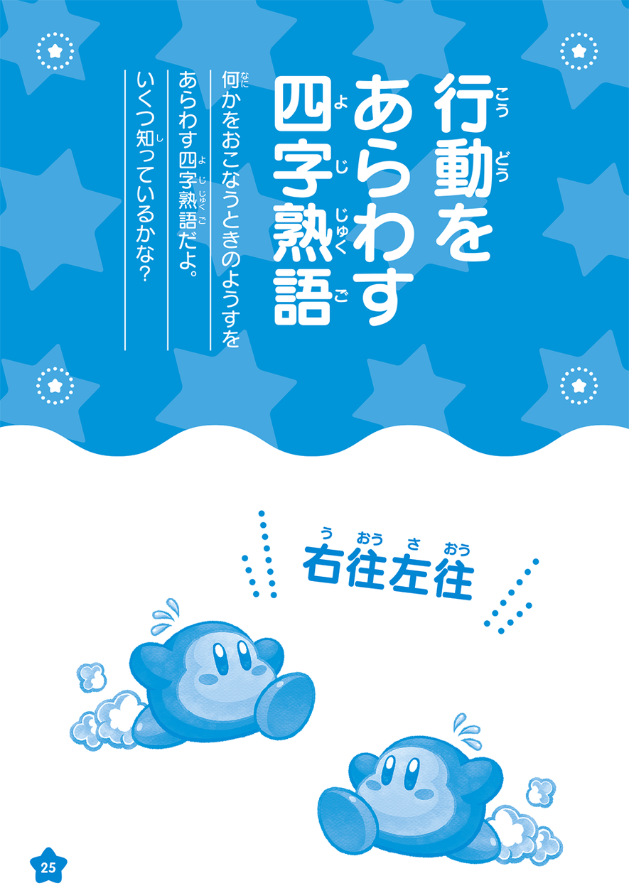使い方の例文にはカービィたちがたくさん登場するから、楽しみながら四字熟語を身につけることができるよ。