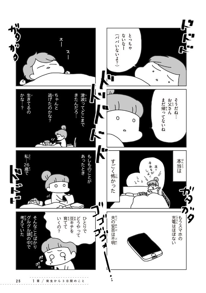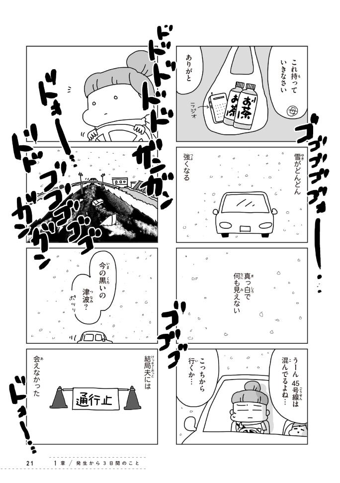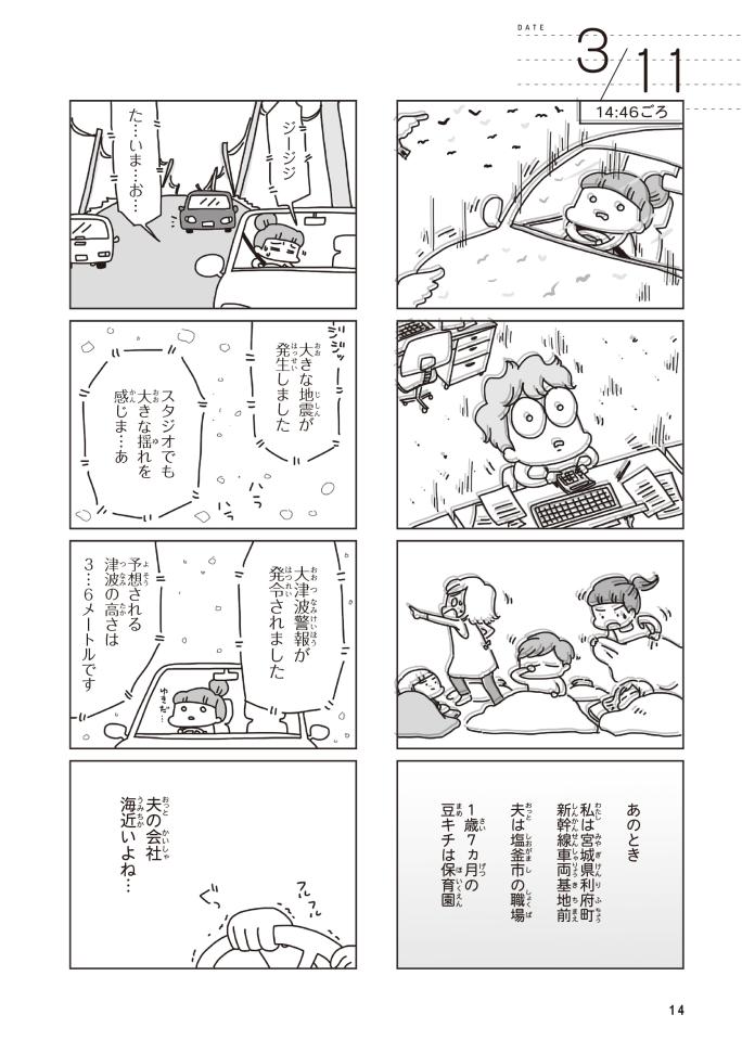 本書は、現在は防災士としても活動する漫画家&イラストレーターである著者が、東日本大震災を経験した当時(2011年3月11日~4月)の詳細なメモを元にまとめています。その中で津波など自然災害を想起させるシーンがございます。