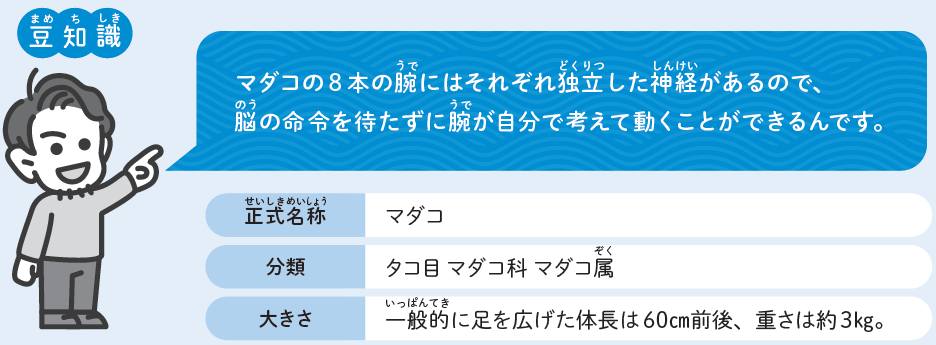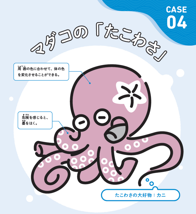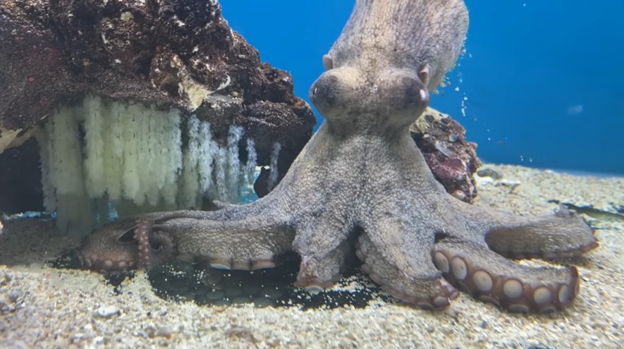 タコは一生で一度しか卵を産まず、卵の世話をしている一か月はエサを食べることもない。これは、エサを探したり食べたりしている間に、子どもをほかの生きものに襲われないようにするためだと言われている。
