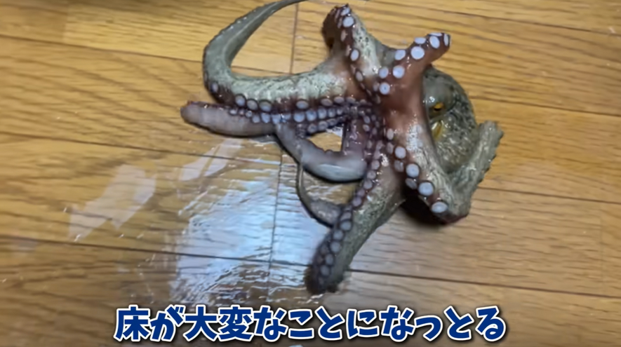 家に到着して早々、またもやバケツから逃げ出すタコ。フローリングの床の上をにゅるにゅると動いてはどこかに行ってしまう。何度もバケツに戻してはみるが、やはりこの追いかけっこがずっと続くのではないかと怖くなった(※n回目)。