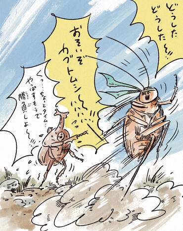 丸山先生:いくつかの理由がありますが、まずは体の重さです。カブトムシは体がとてもかたく、ゴキブリはそれほどかたくありません。昆虫の体は外骨格といって、外側の「から」が骨のような役目をしていますが、カブトムシのようにかたい昆虫では、この「から」が分厚く、とても重くなります。私たちも重い荷物を持つと速く走れないように、体が重いカブトムシやクワガタムシは速く走れないのです。そして軽いゴキブリは速く走れます。