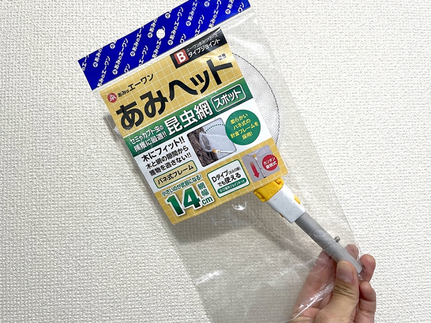 それはエーワンさんが販売している「ピンポイントハンター」と呼ばれるむしとり網です。この網の特徴は2つあり、まずひとつは網の枠が小さいことです。