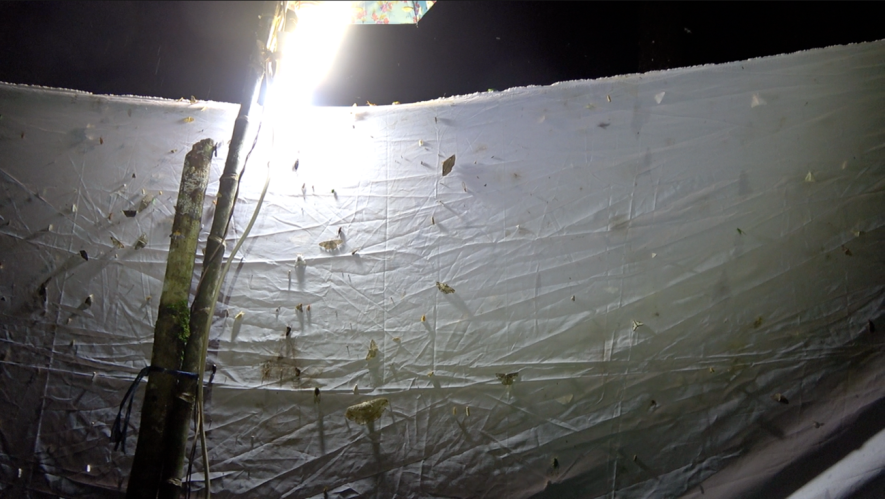 キャンプ地に到着したと同時に、現地の方がライトトラップの準備をしてくれました。キャンプで作ってもらったナシゴレンを食べ、ライトトラップを見に行くと、40時間以上の移動の疲れが吹っ飛ぶような時間が待っていました。