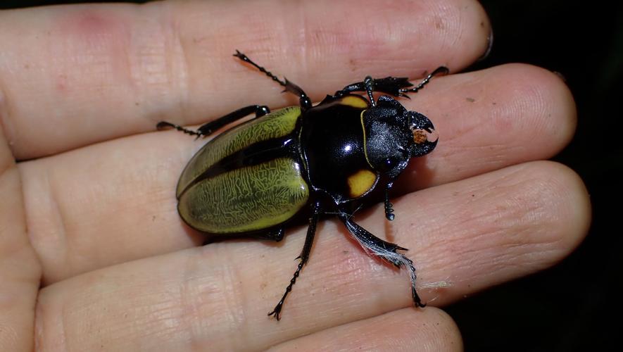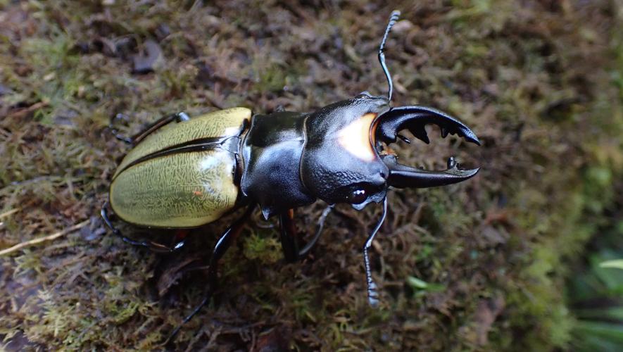 長竿を伸ばしてなんとか採集できたのは、トゥルンカートゥスホソアカクワガタという、エラフスによく似た種類のクワガタでした。前日のライトトラップで飛んで来たものは小さい個体だったので、大型個体のかっこよさに圧倒されました。