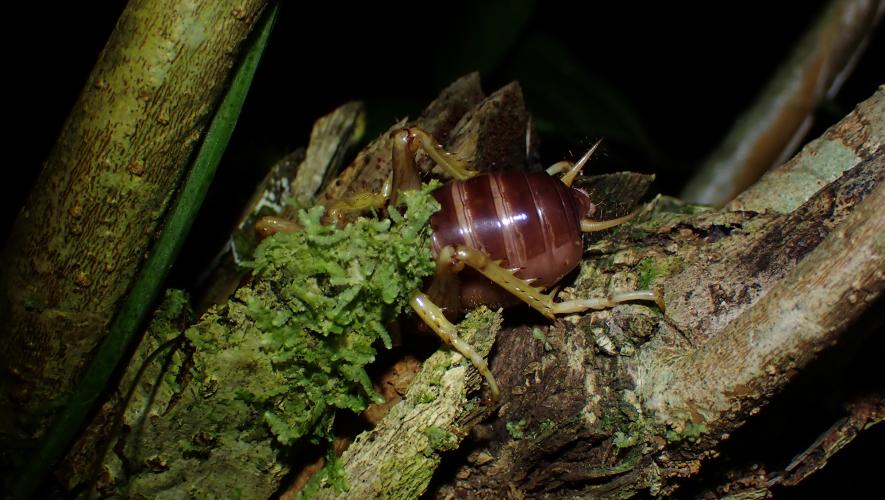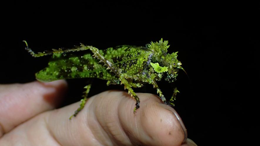 熱帯雨林の苔に擬態したような姿のキリギリス。背中の棘のような部分は硬い。日中に苔の上に紛れているとまず見つけられないと思います。