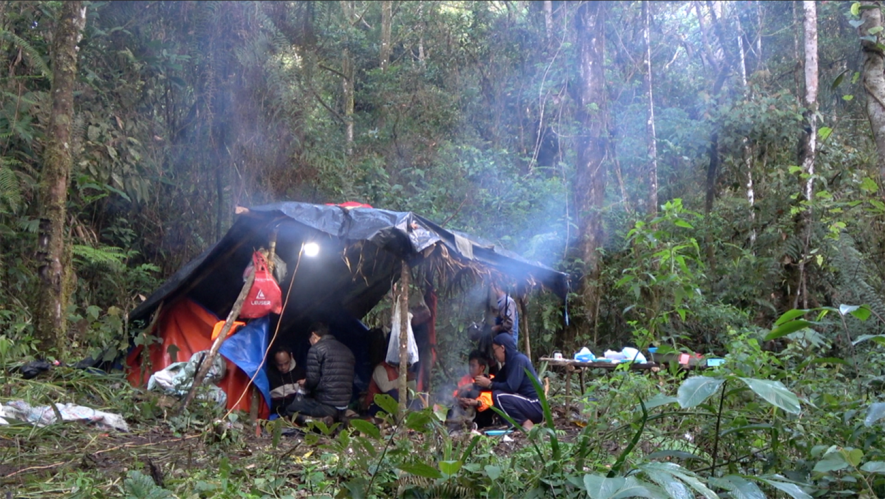 現地の人が運転するバイクの後ろに乗り、ぬかるんだ山道をガタガタと約30分間上り、そこから先はジャングルの中を30分間ひたすら進みます。そして日本を出発してから40時間以上かけて、今回のキャンプ地に到着したのです。